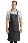 Craftsman styling creates a signature look in this apron that¿s perfect for bistros, pubs, cooking classes and more. The wrinkle-resistant fabric has a denim-like look which blends performance with style to make a sophisticated statement. 7-ounce, 60/40 cotton/poly yarn-dyed twill Adjustable contrast webbing neck strap with antique-finish metal slider Patch pocket, pen pocket Self-fabric waist ties Contrast stitch details Measures: 25'w x 34.5'l